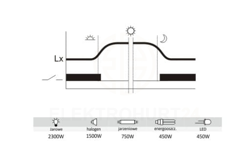 - Próg zadziałania - regulowany: 2 ÷ 1000 Lx