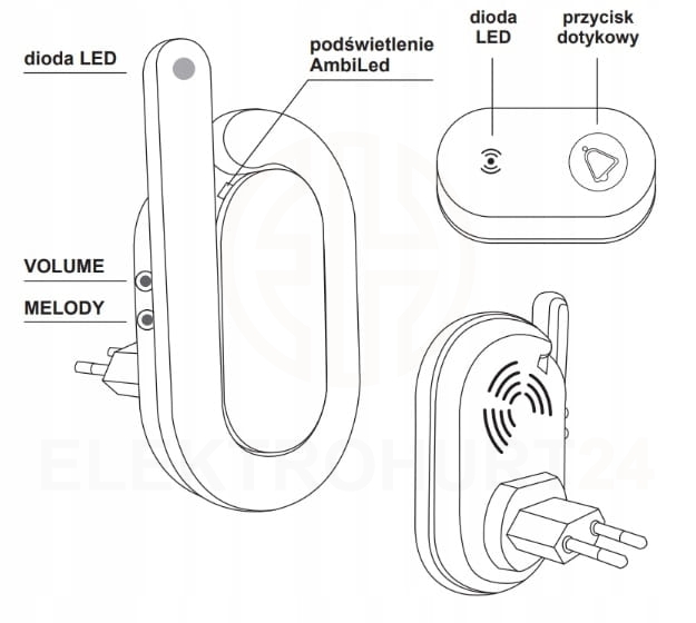 Dzwonek do drzwi bezprzewodowy DRS-985H 230 V BULIK II SUN10000428 Producent: ZAMEL | Seria produktu: SUNDI | Stopień ochrony urządzenia: IP20 | Stopień ochrony przycisku: IP56 | Głośność: 85 dB | Zasięg do 350 m | 14 melodii do wyboru | Wersja zasilania sieciowego (DRS-985) - Dzwonek zasilany bezpośrednio z gniazdka elektrycznego