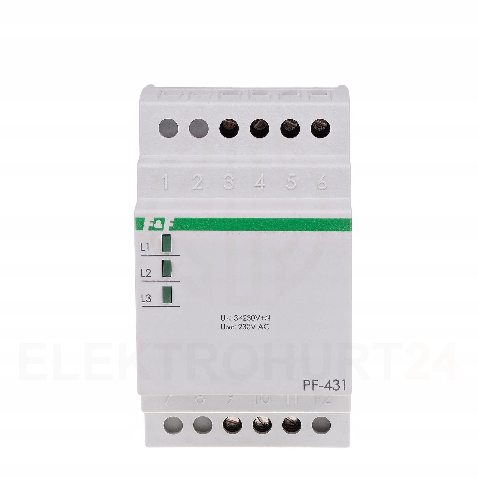 Przełącznik przyjmuje napięcie trójfazowe i kontroluje wartości napięć faz, aby utrzymać stabilne napięcie wyjściowe w zakresie 190-280 V. Diody LED sygnalizują załączenie odpowiedniej fazy na wyjściu. Faza L1 ma priorytet, ale w przypadku jej niedostępności, układ automatycznie przełącza na fazę L2, a następnie L3. W przypadku nieprawidłowego podłączenia przewodu N zasilania, diody LED informują o błędzie.
