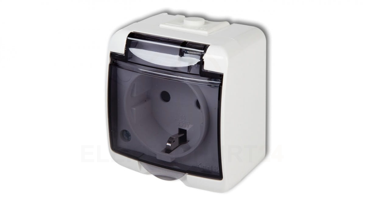 JUNIOR Gniazdo pojedyncze z/u SCHUKO (klapka dymna) biały IP54 GHE-1sd