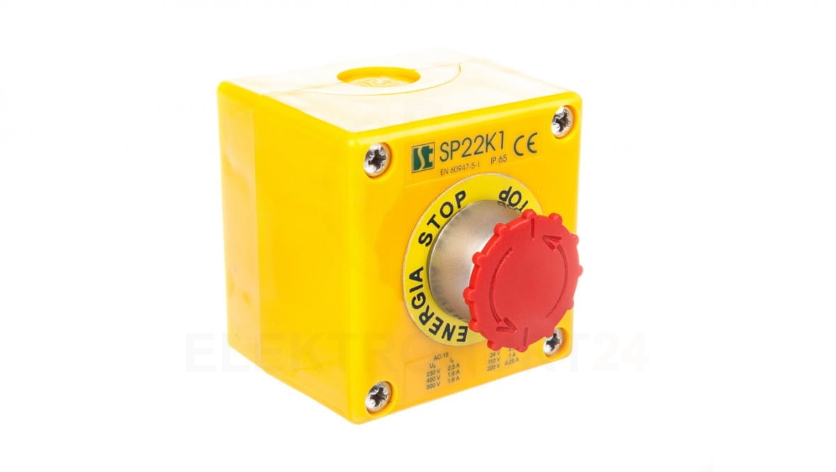Kaseta z przyciskiem bezpieczeństwa przez obrót 1R IP65 żółta 1x dławnica M20 SP22K1\05-1