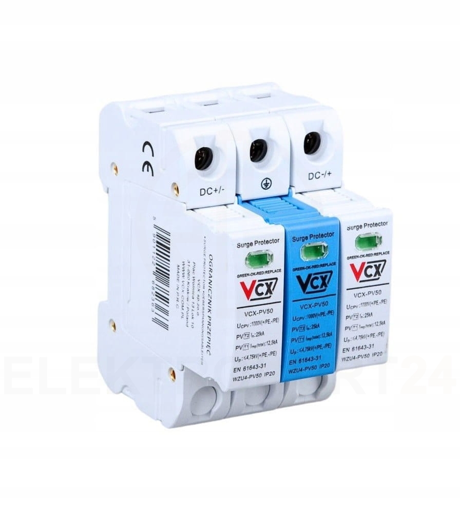 Ochronnik VCX-50PV-B+C klasy T1T2 12,5kA wyposażony jest w warystory (MOV) w modułach DC+ i DC– oraz iskiernik gazowy (GDT) w module PE, co skutecznie eliminuje problem starzenia się iskiernika pod wpływem tzw. prądu upływu i prądu roboczego.