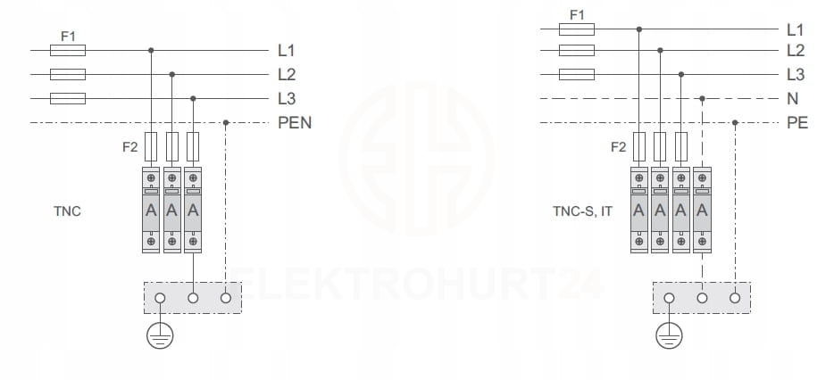 Ograniczniki trójfazowe zajmują cztery moduły w rozdzielnicy elektrycznej. Ochronnik typu „1+2” (dawnej klasy B+C) , zapewniają ochronę przed przepięciami atmosferycznymi, spowodowanymi uderzeniem pioruna w obiekty znajdujące się w sąsiedztwie linii napowietrznych lub bezpośrednio w linię w dużej odległości od miejsca zainstalowania ograniczników.