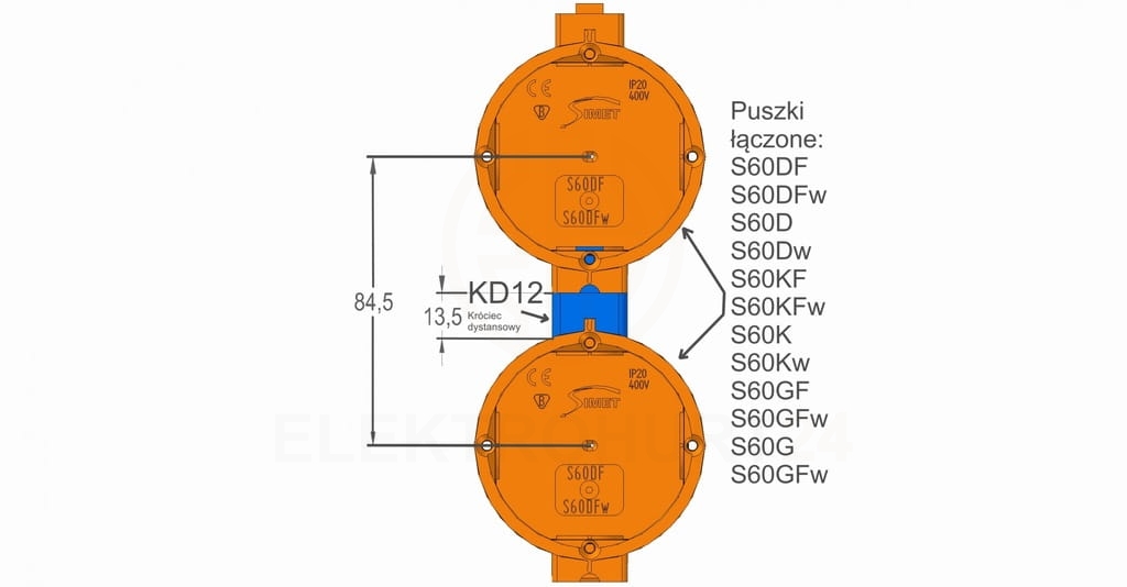Puszka podtynkowa Ø60 mm ekstra głęboka szeregowa S60GF – pomarańczowa