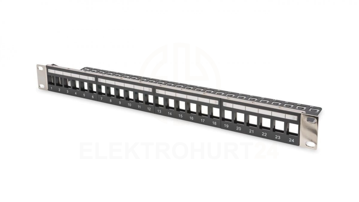 Panel krosowy modularny 19 24x keystone,ekranowany,1U,czarny,prowadnica kabli,wymienne pola opisowe DN-91411-LF