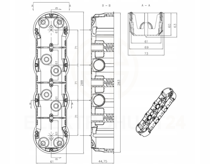 Producent: Pawbol | Typ: Puszka podtynkowa poczwórna | Średnica: 4 × Ø60 mm | Głębokość: wersja głęboka