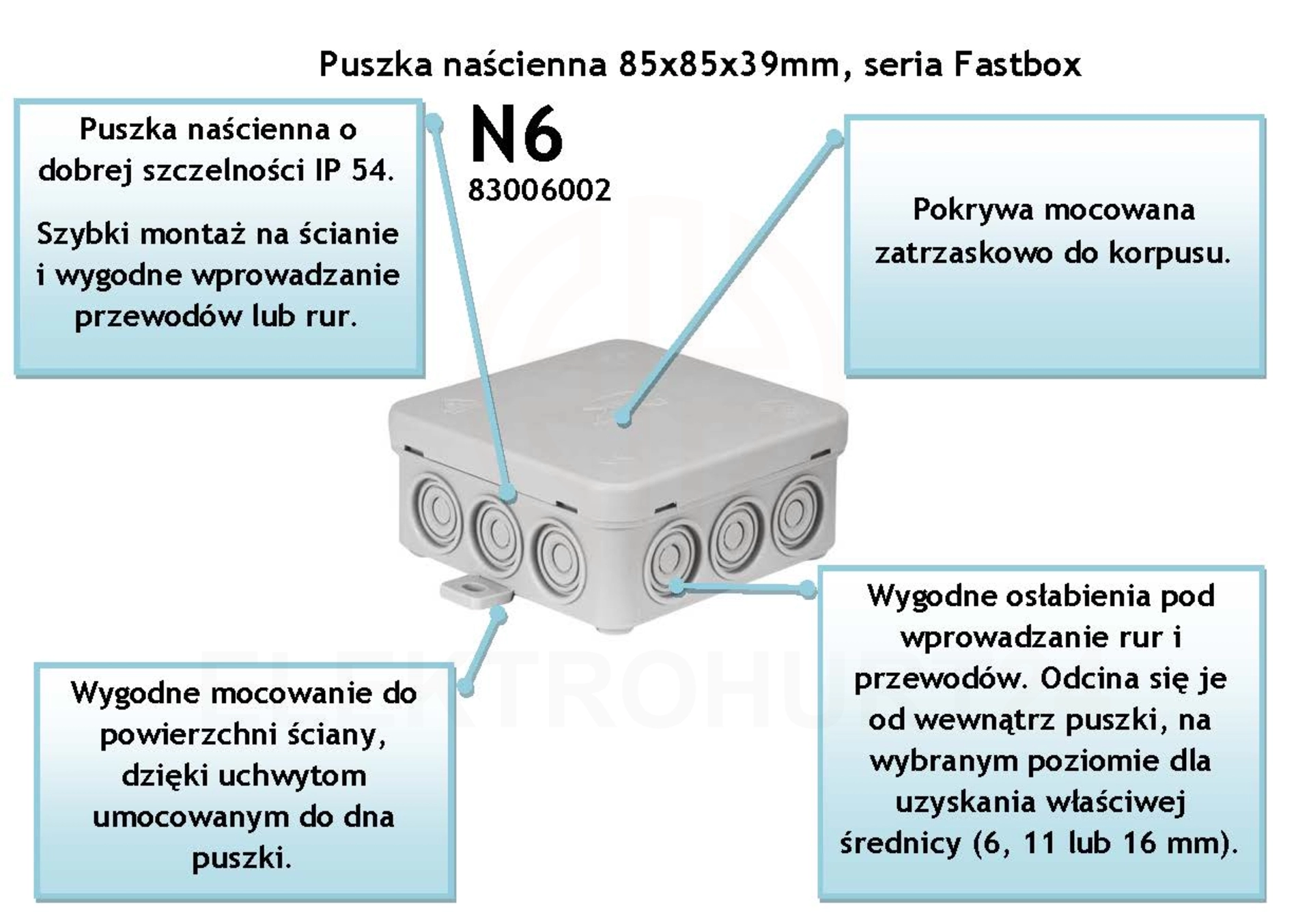 Puszka n/t hermetyczna z dławicą zintegrowaną 85x85x39mm IP54 biała N6 83006006