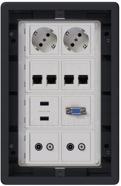 - Pojemność na 8 modułów K45, dodatkowo wspiera adaptację 4 modułów CIMA – idealna do rozbudowanej instalacji multimedialnej i elektrycznej