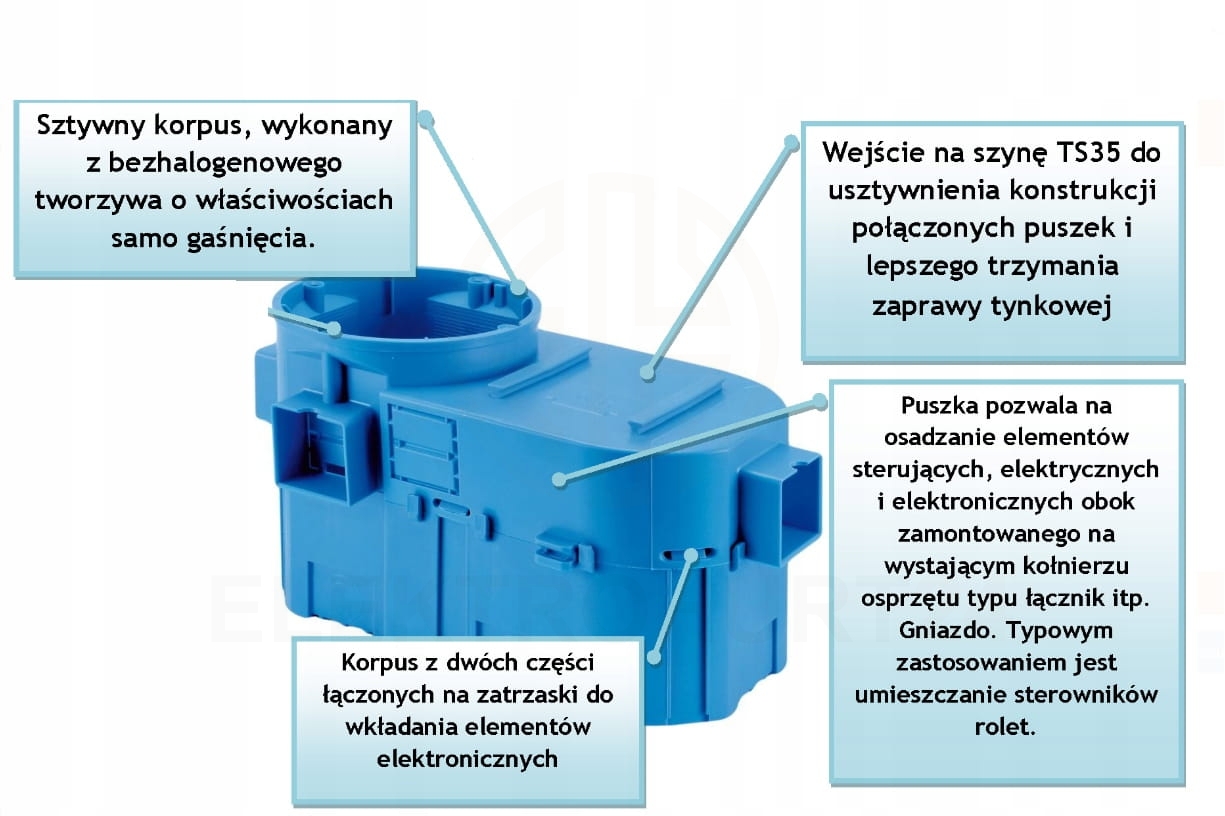 Inaczej puszka montażowa lub łączeniowa. Często wykorzystywana w ścianach murowanych w instalacjach podtynkowych. Produkt umożliwia sprawne osadzenie specjalistycznych urządzeń elektrycznych, połączenie większej ilości przewodów, a także zmontowanie elementów automatyki. Zaliczana jest do jednych z najważniejszych elementów wykorzystywanych podczas budowania, naprawiania oraz modernizowania sieci. Wyprodukowana z samogasnącego, bezhalogenowego materiału.