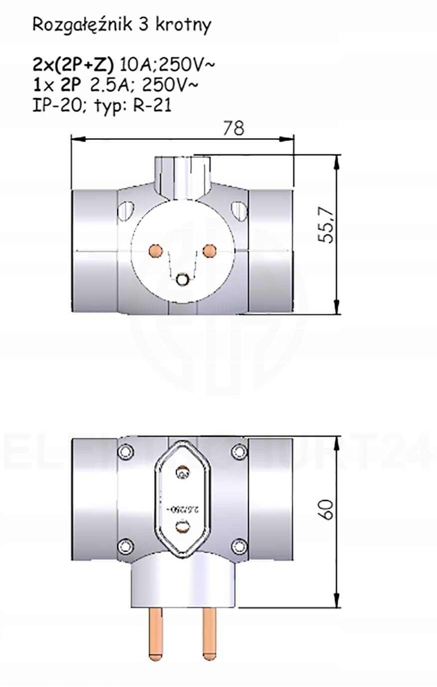 ROZGAŁĘŹNIK WTYCZKOWY 2x2P+Z + 1XEURO R-21