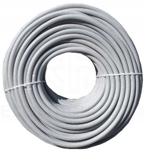 Rura instalacyjna, karbowana, giętka, nie rozprzestrzeniająca płomienia wykonana z PCV w kolorze szarym (RAL7035), ze stalowym pilotem ułatwiającym przeciąganie przewodów.