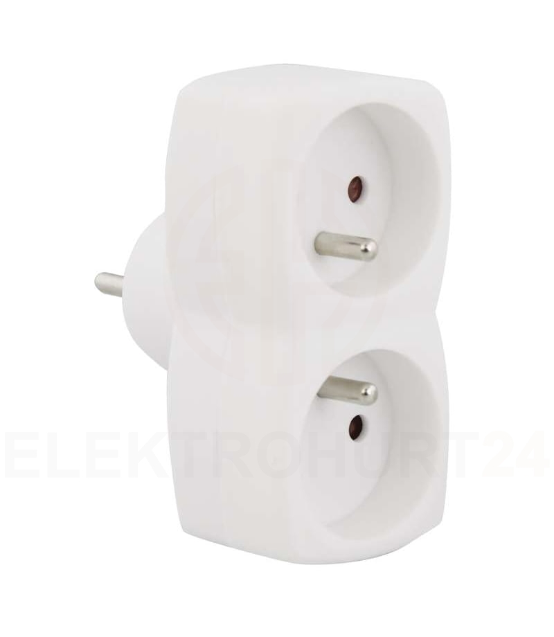 Rozgałęźnik z dwoma okrągłymi gniazdami z bolcem. Przydatny zawsze wtedy, gdy potrzeba więcej gniazd prądowych.