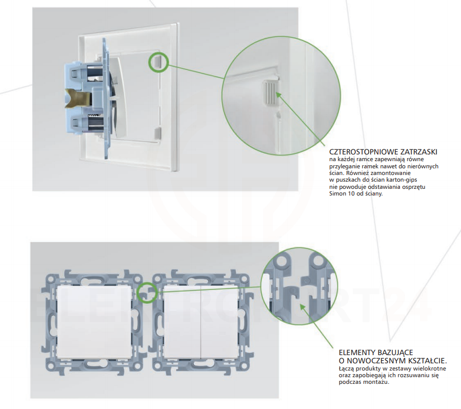 Gniazdo multimedialne KONTAKT SIMON serii 10 przeznaczone do montażu podtynkowego za pomocą śrub lub zatrzasków (pazurków). Wykonany z wysokiej jakości tworzywa sztucznego w kolorze białym i wyposażony w plastikowy wspornik. Kształt i kolor sprawi, że będzie pasował do tradycyjnie lub nowocześnie urządzonych pomieszczeń.Do łącznika należy dobrać odpowiednią ramkę maskującą. Uniwersalna konstrukcja umożliwia łatwy, szybki i bezpieczny montaż zarówno w ramce pojedynczej, jak i wielokrotnej.