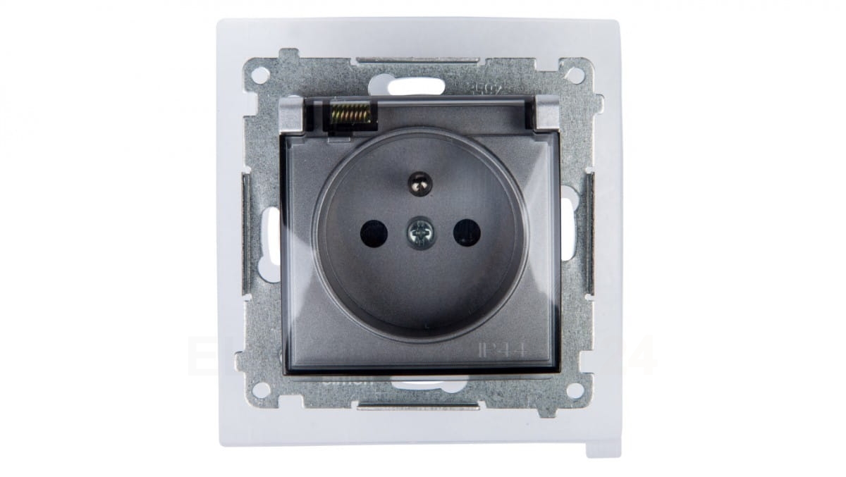 Simon 54 Gniazdo bryzgoszczelne z/u IP44 z przesłoną torów i klapką transparentną srebrny mat DGZ1BZ.01/43A