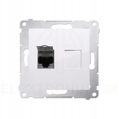 Gniazdo komputerowe pojedyncze RJ45 kat. 6, ekranowane z przesłoną, serii Kontakt Simon 54. Przeznaczone do montażu podtynkowego za pomocą śrub lub zatrzasków (pazurków). Wykonany z wysokiej jakości tworzywa sztucznego w kolorze białym i wyposażony w metalowy wspornik. Kształt i kolor sprawi, że będzie pasował do tradycyjnie lub nowocześnie urządzonych pomieszczeń. Do gniazda należy dobrać odpowiednią ramkę maskującą na pozostałych naszych aukcjach.