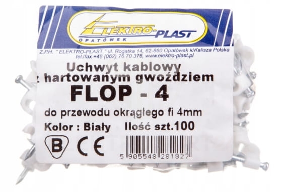 Uchwyty kablowe z gwoździem typu FLOP, przeznaczone są do mocowania przewodów lub poszczególnych żył kabla do podłoża za pomocą gwoździa. Mocowanie odbywa się poprzez wbicie hartowanego gwoździa do podłoża. Uchwyty tego typu stosuje się wtedy gdy zachodzi konieczność uzyskania szybkiego i pewnego zamocowania, szczególnie w podłożach drewnianych lub gazobetonowych. W przypadku wystąpienia konieczności przytwierdzenia przewodu do podłoża o wysokim stopniu twardości (np. beton) zaleca się stosowanie kołków rozporowych lub innego rodzaju uchwytów.