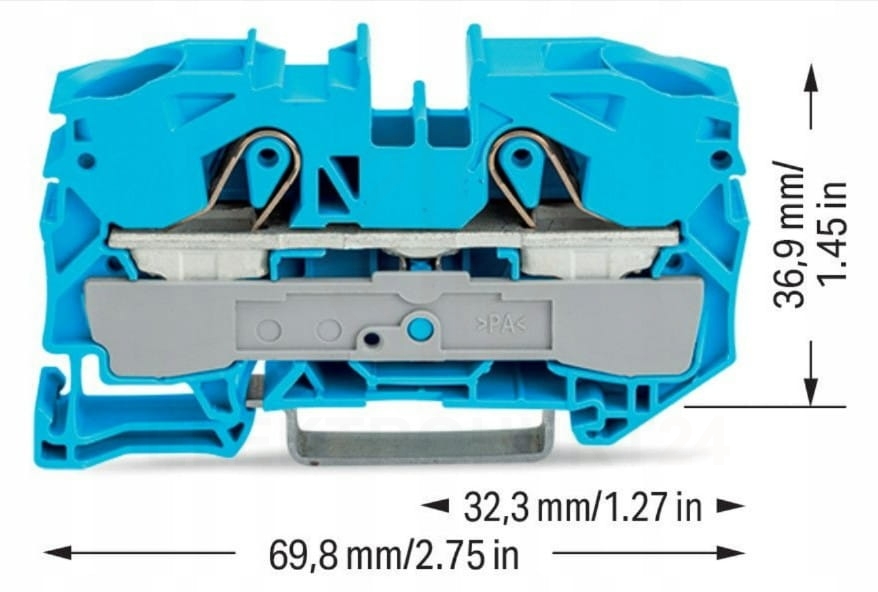 WAGO 2016-1204 niebieska to profesjonalna złączka 2-przewodowa 16 mm², przeznaczona do montażu na szynie DIN w rozdzielnicach. Wyraźna kolorystyka ułatwia identyfikację obwodów i porządek w instalacji.