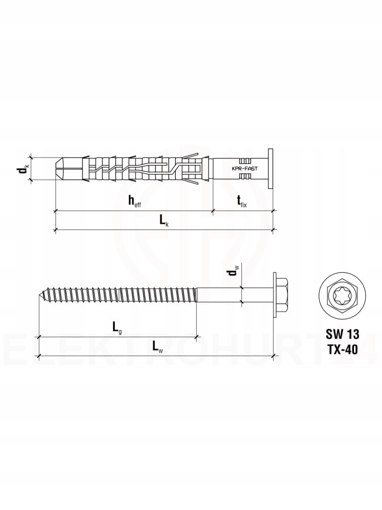 Kołek ramowy rozporowy z wkrętem z łbem sześciokątnym i gniazdem TX 10 x 200