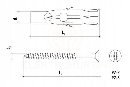 Kołek uniwersalny klasyczny do wszystkich podłoży z wkrętem z łbem stożkowym z gniazdem PZ