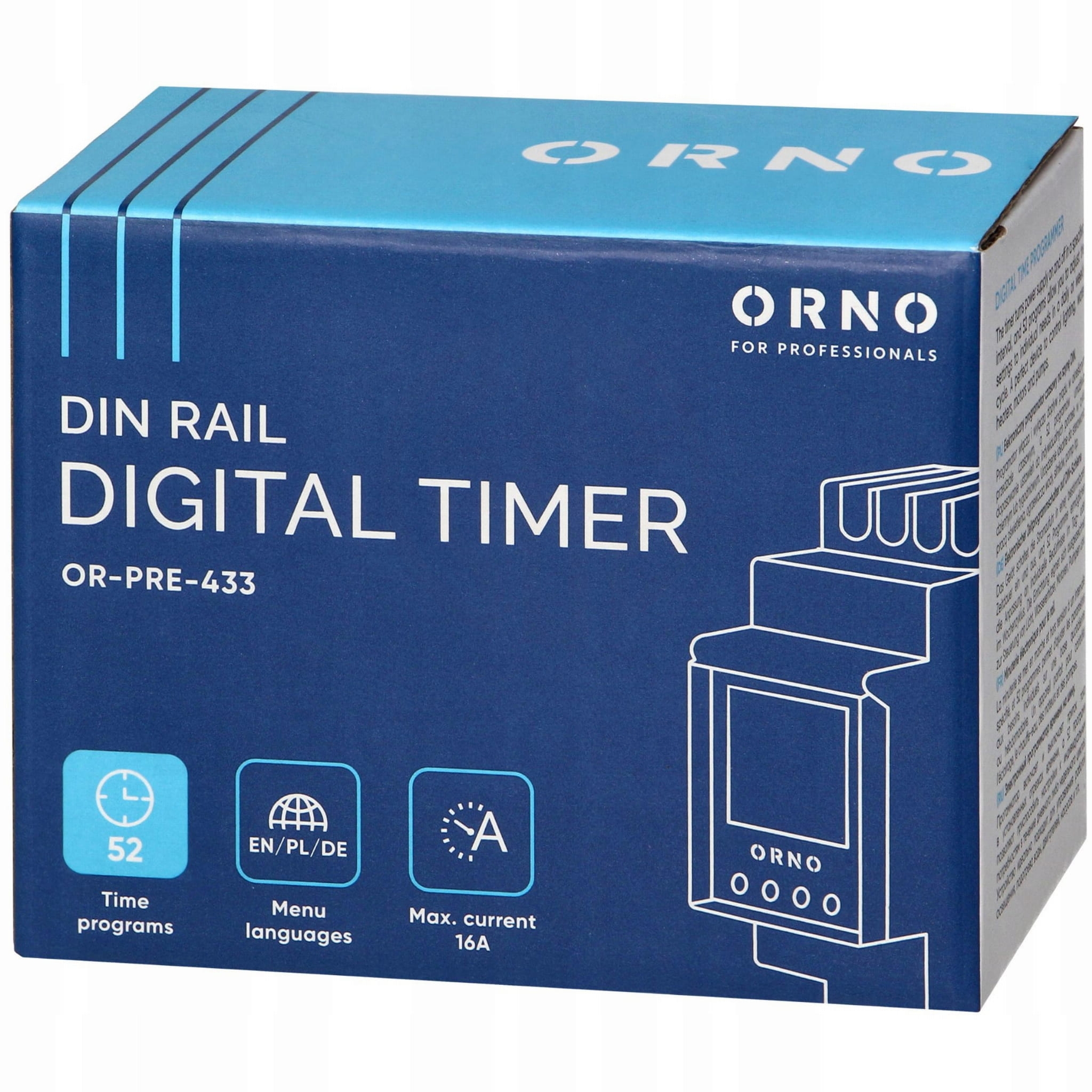 ORNO OR-PRE-433 to nowoczesny elektroniczny programator czasowy, który pozwala na precyzyjne sterowanie zasilaniem urządzeń elektrycznych w oparciu o ustawiony harmonogram. Dzięki możliwości zaprogramowania aż 52 niezależnych cykli włączeń i wyłączeń w trybie tygodniowym, programator zapewnia pełną elastyczność działania, idealną zarówno do użytku domowego, jak i biurowego.