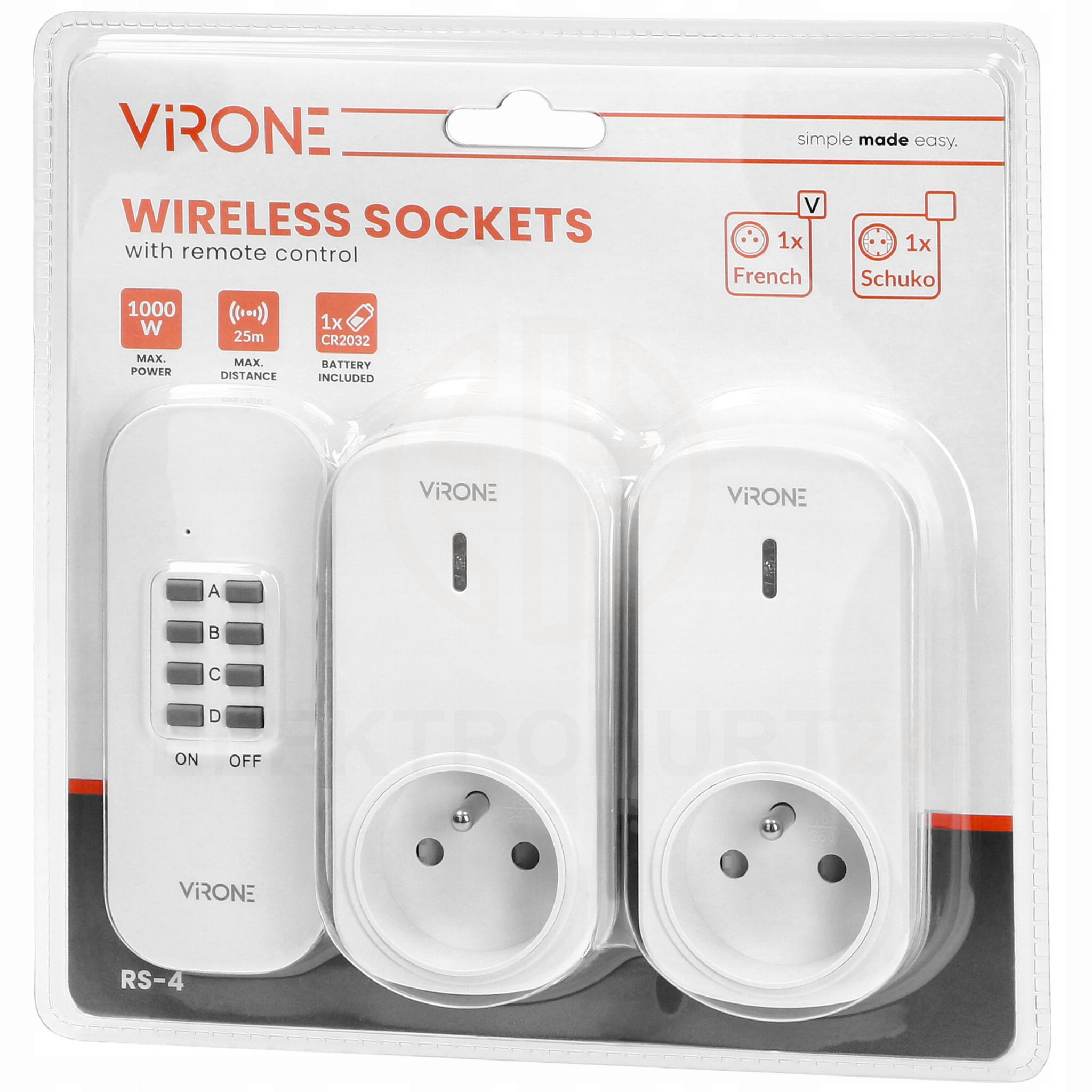 Zestaw gniazd RS-4 marki ORNO, umożliwiających bezprzewodowe włączanie i wyłączanie urządzeń elektrycznych wewnątrz pomieszczeń m.in. lamp, TV, wentylatorów, klimatyzatorów, itp. Włączanie i wyłączanie realizowane jest za pomocą pilota (nadajnika) lub bezpośrednio na odbiorniku. Urządzenia, posiadają funkcję learning system (automatyczne logowanie). Dwa bezprzewodowe gniazda z uziemieniem, na pilota posiadają zasięg do 25 metrów w terenie otwarty.