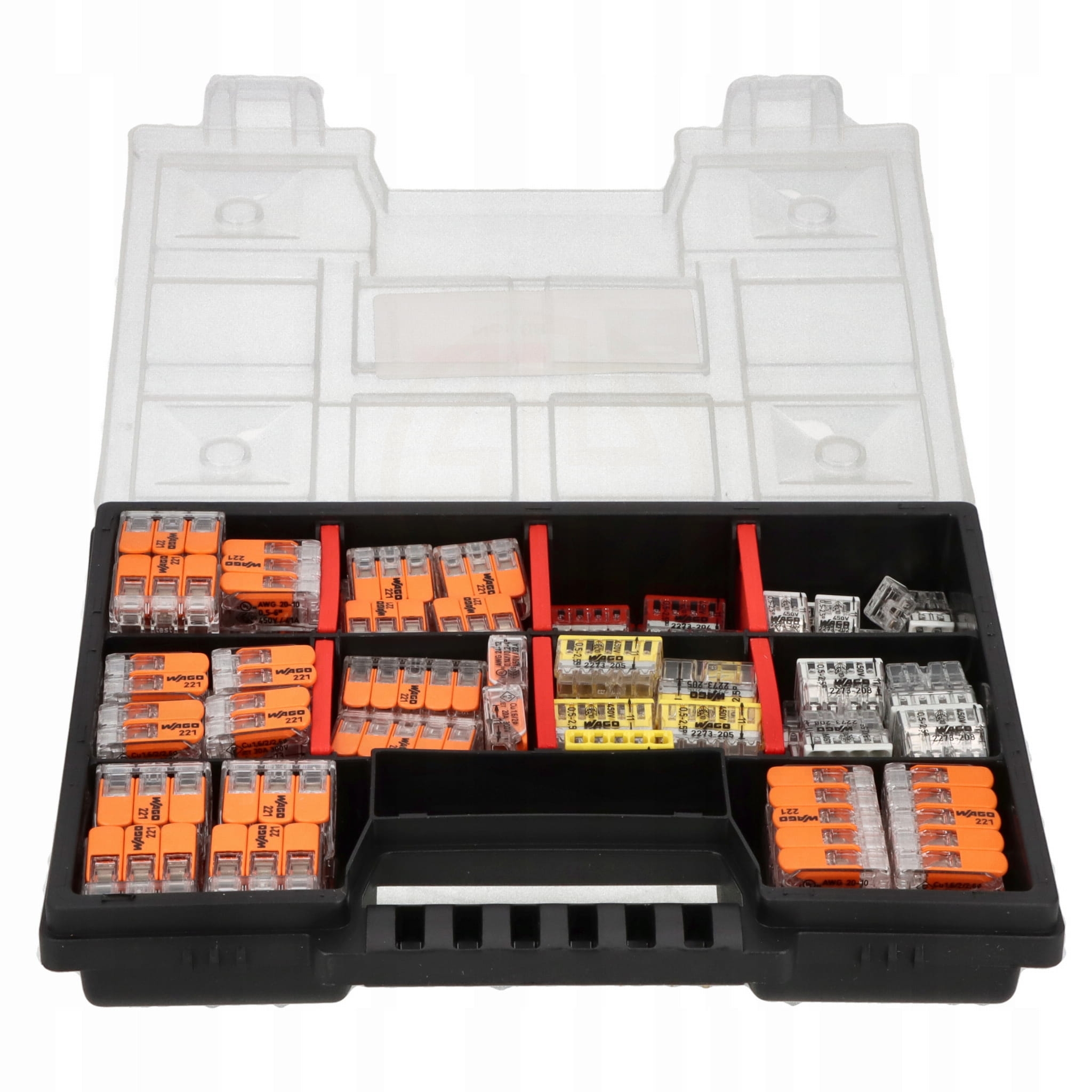 Zestaw złączek WAGO 221 2273 w organizerze do instalacji elektrycznych 120