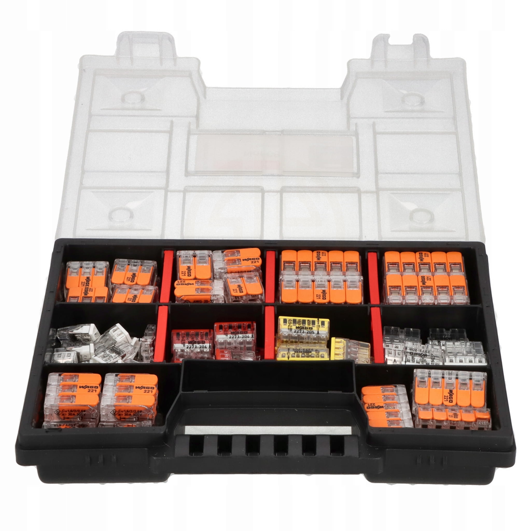 Zestaw złączek WAGO 221 2273 w organizerze do instalacji elektrycznych